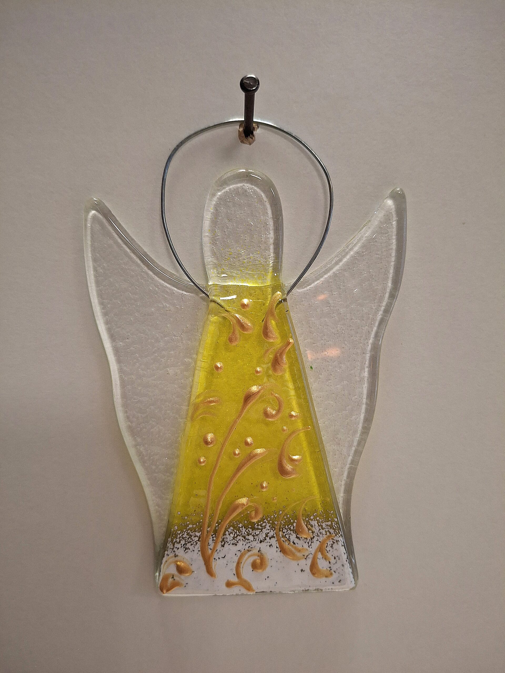 Schutzengerl aus Glas mit Draht zum Hängen gelb